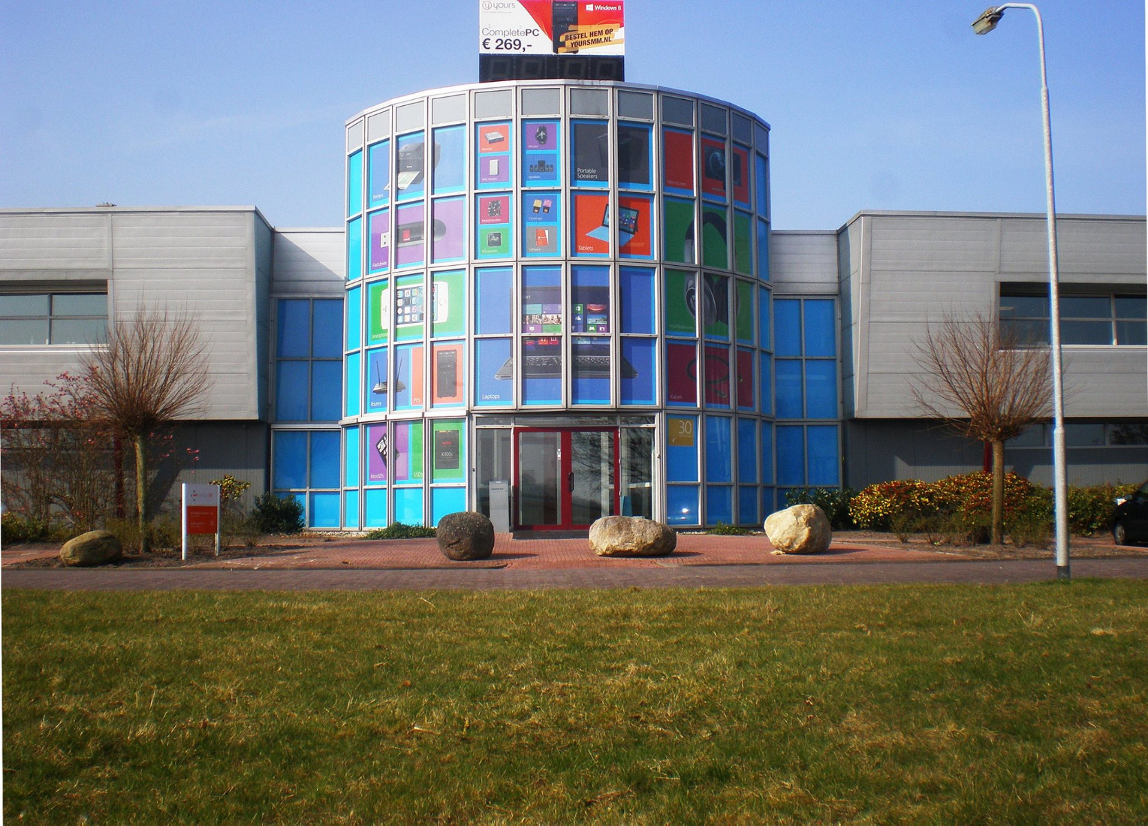 Die Fassade des Gebäudes besteht hauptsächlich aus Glas. Im Winter lässt dies viel Kälte durch und im Sommer sorgt die Sonne für hohe Temperaturen im Inneren. Hierfür wurde eine clevere Lösung gefunden. Das Glas ist mit dem so genannten One Way Vision-Material beklebt. Das sind Aufkleber mit kleinen Löchern. Auf der einen Seite des Aufklebers befinden sich Bilder und auf der Rückseite ist der Aufkleber durchsichtig, so dass man einfach nach draußen schauen kann. Im Winter sorgt dies dafür, dass die Wärme weniger schnell durch die Fenster entweicht. Im Sommer blockiert sie die Sonnenstrahlen. Fazit: weniger Klima- und Heizkosten und das Gebäude sieht als Litfaßsäule von der Autobahn aus gut aus!